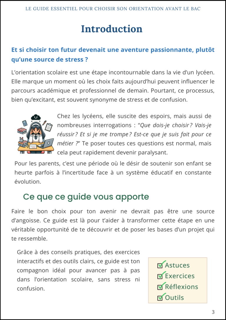 J’ai donc conçu cet ebook comme une réponse concrète à ce besoin, pour offrir aux lycéens et à leurs parents un cadre clair, des outils pratiques et une méthode efficace pour avancer sereinement dans l’orientation.